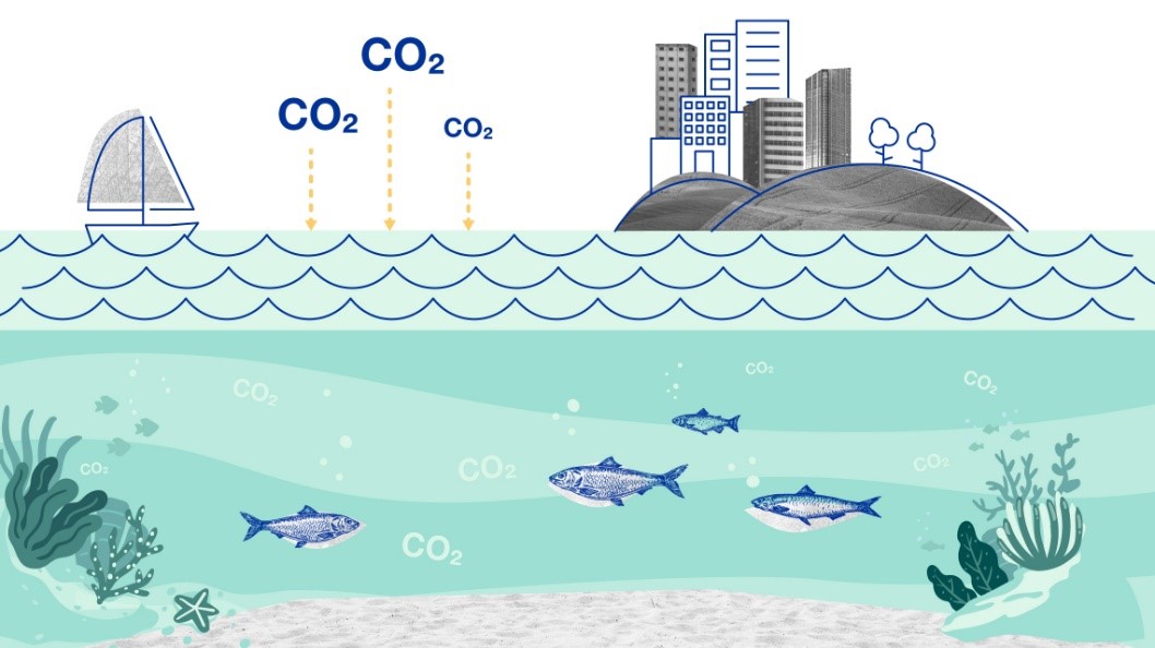 Đại dương hấp thụ một phần tư lượng CO2 thải ra trong khí quyển và có khả năng lưu trữ lượng CO2 nhiều hơn 50 lần so với trong khí quyển. Lượng CO2 tăng lên dẫn đến axit hóa đại dương, có thể ảnh hưởng đến các sinh vật biển không quen với điều kiện axit, tác động đến toàn bộ hệ sinh thái, chuỗi thức ăn và sau cùng là sinh kế của những cộng đồng sinh vật phụ thuộc vào đại dương. Khi nước trở nên quá chua, môi trường sống của sinh vật sẽ bị phá hủy.